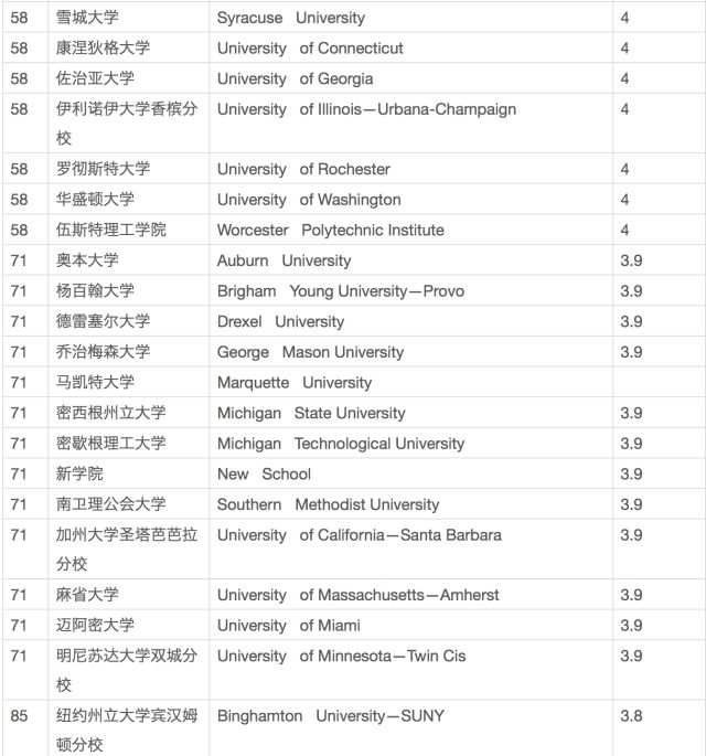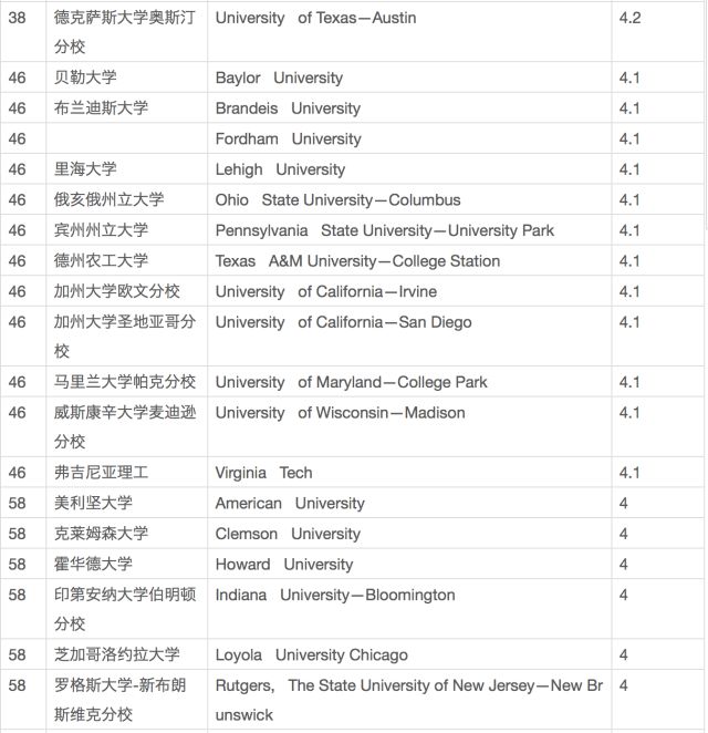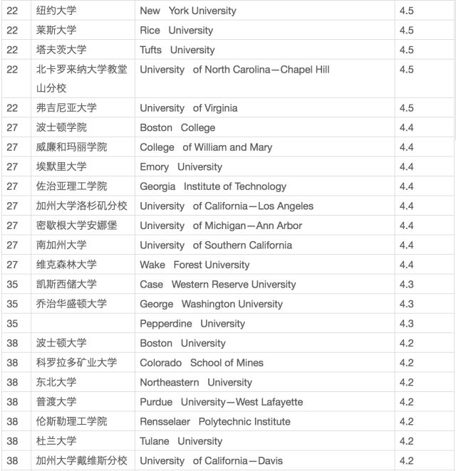 USNews給全國範圍內的2200所高中的高中申請導師發去了邀請函,這裏面的高中都是在USnews排名中獲得了至少是金牌、銀牌或者銅牌的高中。另外,還有許多所全國最大、最著名的獨立私立高中的高中申請導師也在這之內,二者加起來的總數在2552人。他們要求老師根據學術水平、師資、學生評價、畢業生情況、科研及課程等方面對美國大學進行評比打分,評分範圍是1-5分,統計後算出平均分,由此得到了下面這張表單。