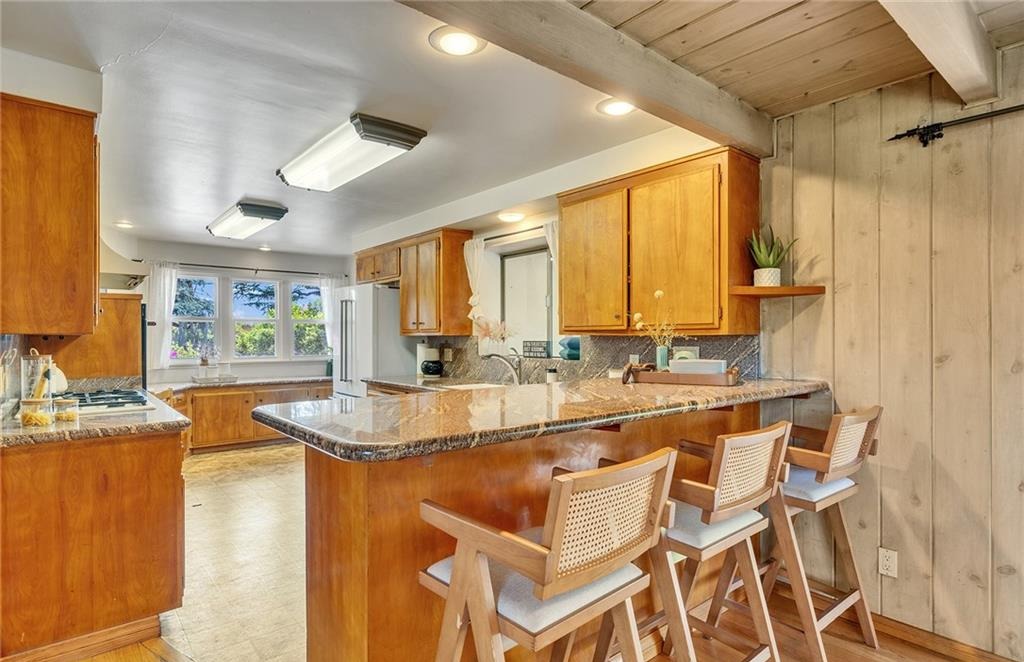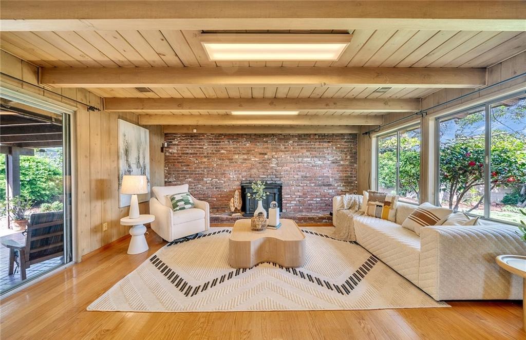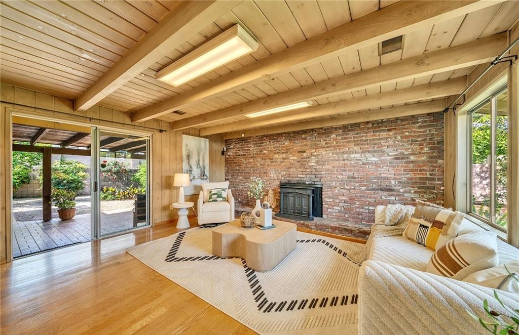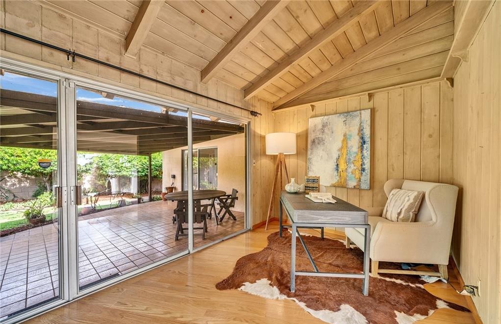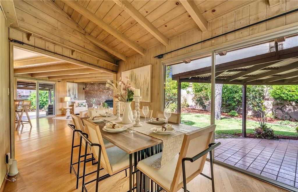 • 3 BD / 3 BA (2,318 sq. ft.) with vaulted wood-plank ceilings and exposed beams.